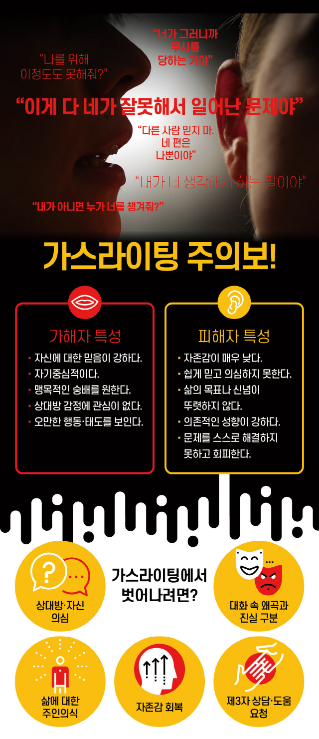가스라이팅은 심리적 조작을 통해 타인의 인식을 왜곡하고 자신의 통제 하에 두려는 행위를 말합니다. 이 용어는 1938년 플레이 'Gas Light'에서 유래되었으며, 이 플레이에서 남편이 조명의 밝기를 조절함으로써 아내의 인식을 조작하는 내용을 다루고 있습니다. 가스라이팅은 피해자가 자신의 기억이나 판단을 신뢰하지 못하게 만들고, 점차 의존적이고 복종적인 상태로 몰아가는 심리적 학대의 한 형태입니다. 이는 개인 관계 뿐 아니라 사회적, 정치적 상황에서도 나타날 수 있으며, 장기적으로는 피해자의 정신 건강에 심각한 영향을 미칠 수 있습니다.