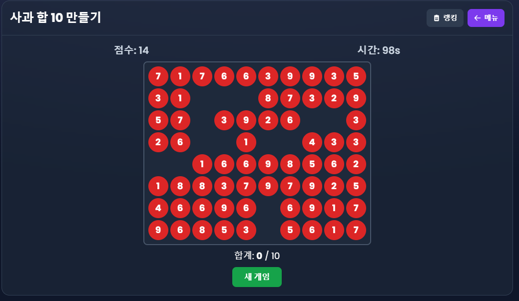 게임판에는 1부터 9까지의 숫자가 적힌 빨간 사과들이 가득 차 있습니다. 여러분의 임무는 간단합니다. 마우스나 손가락으로 사과들을 드래그하여, 선택한 사과들의 숫자 합이 정확히 10이 되도록 만드는 것입니다. (예: 1-9, 2-3-5, 1-2-7...)