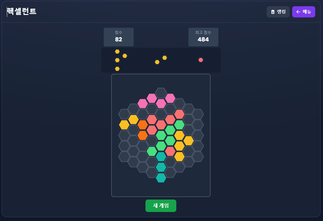 하단에 주어지는 다양한 모양의 육각형 블록 조각들을 드래그하여, 보드 위의 빈칸에 전략적으로 배치하세요.
